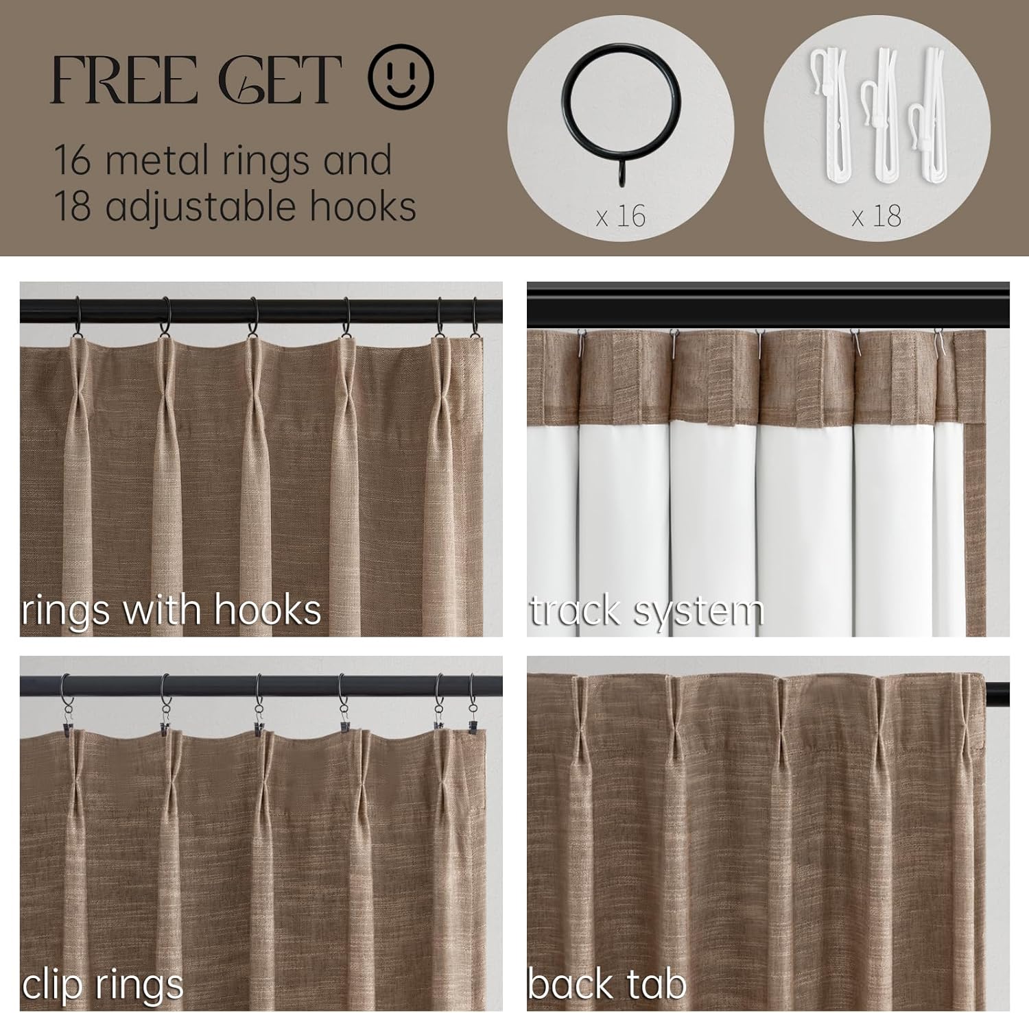 96 Inch Long Pinch Pleated Dark Linen Color Curtains,100% Blackout Thermal Insulated Natural Pinch Pleat Rustic Country Style Drapes with Hooks Rings 2 Panel Sets,Taupe Tan 8FT Window Curtain