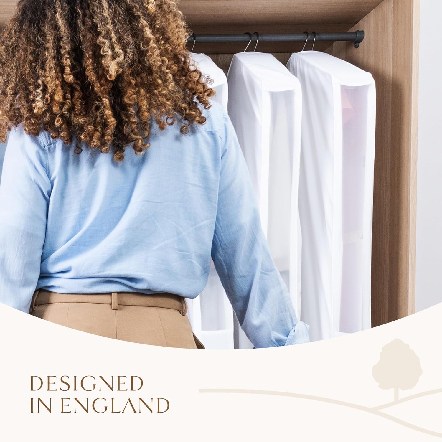 Our breathable 100% organic cotton garment bags protect from moisture, light, dust and moths.