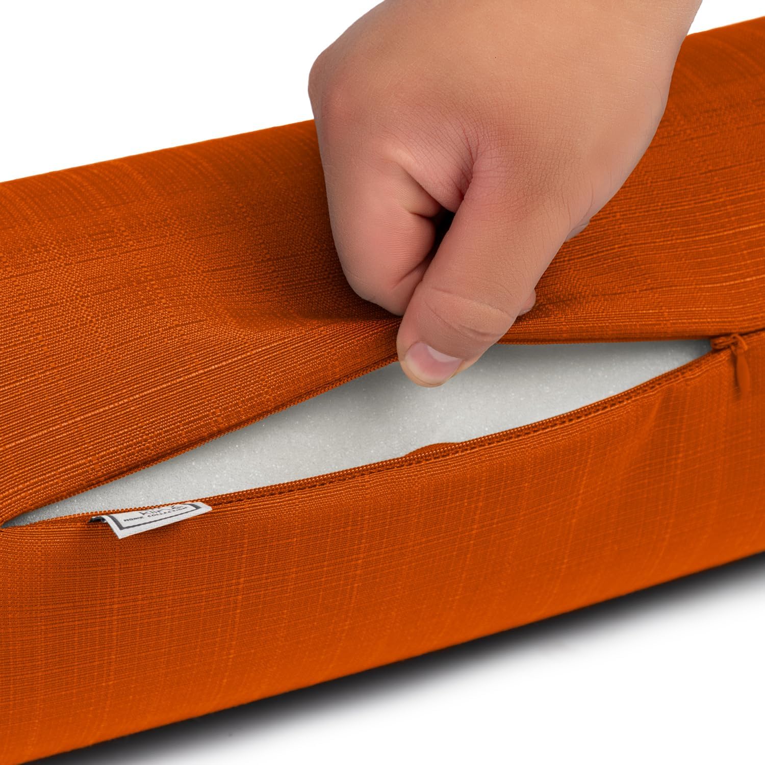 Round neckroll bolster with zipper, cording, and firm foam insert. Removable cover.